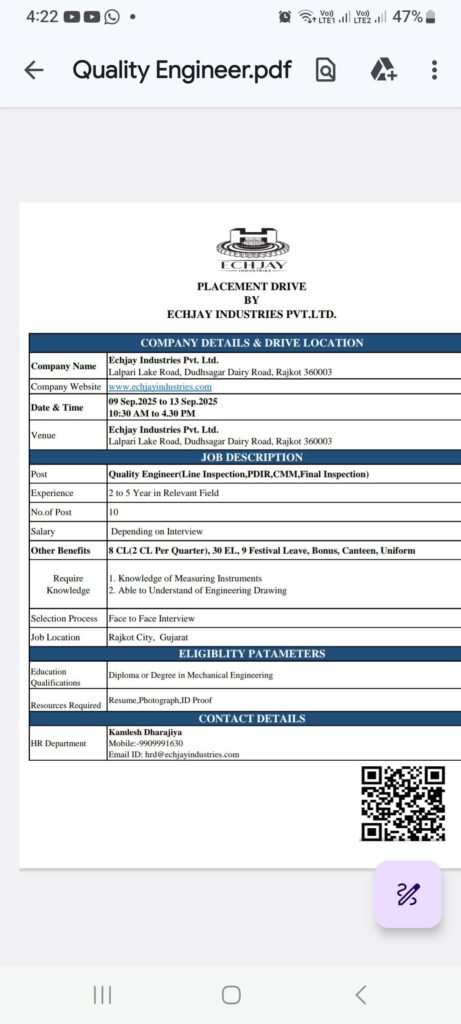 Echjay Industries Pvt.Ltd | Diploma Holder | Walk in Interview Drive Rajkot Gujarat 2025