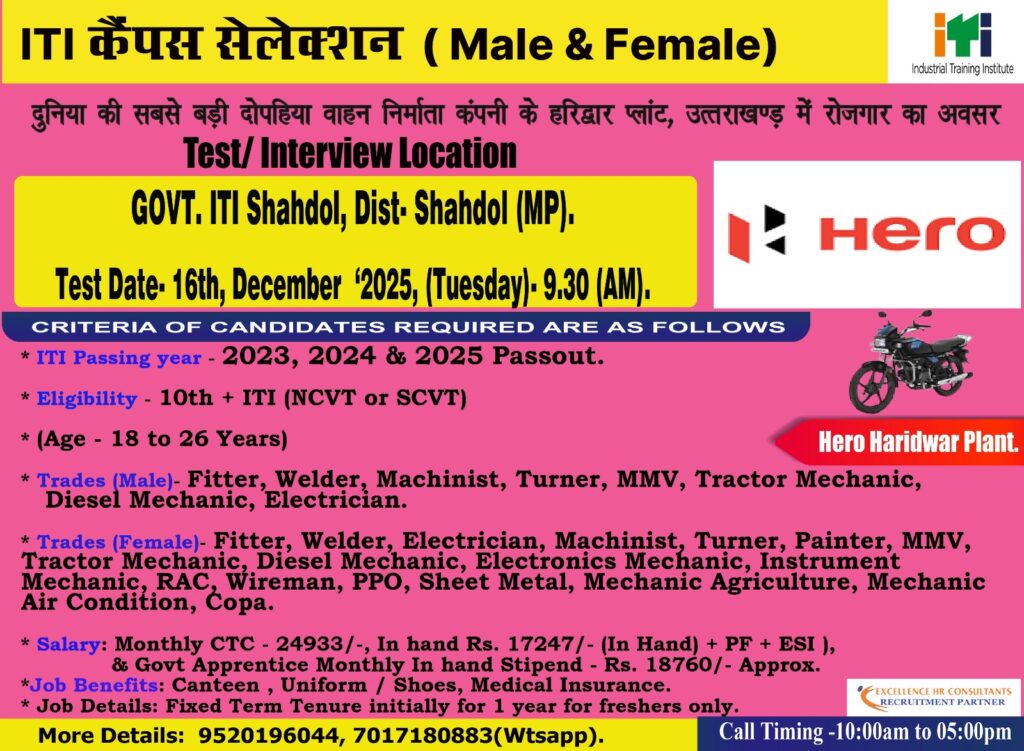 Hero Motocorp ITI Campus Placement 2025 | ITI Pass | Male & Female | Walk in Interview | open Campus Placement 2025
