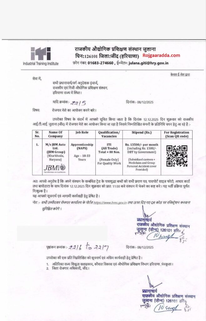 Time- 09:30 am Venue- राजकीय औद्योगिक प्रशिक्षण संस्थान जुलाना Registrationn Link– Click Here |