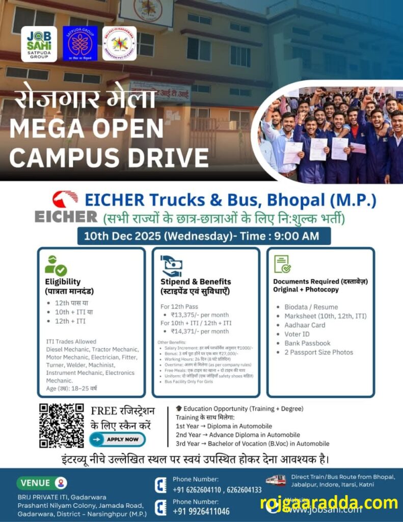 Rojgar Mela MP 2025 | 12th & ITI Pass | Walk in Interview | Open Campus Placement | Dec 2025